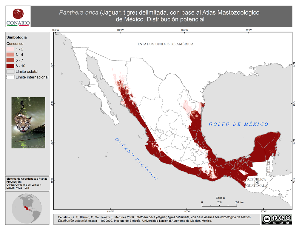 - Ceballos, G., S. Blanco, C. González, E. Martínez, (2006). 'Panthera onca (Jaguar, tigre) delimitada, con base al Atlas Mastozoológico de México. Distribución potencial', escala: 1:1000000. Instituto de Biología, Universidad Nacional Autónoma de México. Proyecto: DS006, Extraído del proyecto DS006 Modelado de la distribución de las especies de mamíferos de México para un análisis GAP. Escala 1:1000000. El proyecto fue financiado por la Comisión Nacional para el Conocimiento y Uso de la Biodiversidad, México.. México.