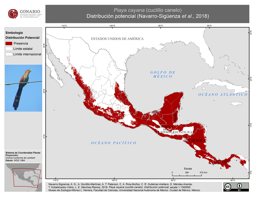 - Navarro-Sigüenza, A. G., A. Gordillo-Martínez, A. T. Peterson, C. A. Ríos-Muñoz, C. R. Gutiérrez-Arellano, D. Méndez-Aranda, T. Kobelkowsky-Vidrio, L. E. Sánchez-Ramos, (2018). 'Piaya cayana (cuclillo canelo). Distribución potencial.', escala: 1:1300000. edición: 1. Museo de Zoología Alfonso L. Herrera, Facultad de Ciencias, Universidad Nacional Autónoma de México. Proyecto: JM071, Mapas de distribución de las aves terrestres nativas de Mesoamérica. El Proyecto fue financiado por la Comisión Nacional para el Conocimiento y Uso de la Biodiversidad (CONABIO).. Ciudad de México, México..