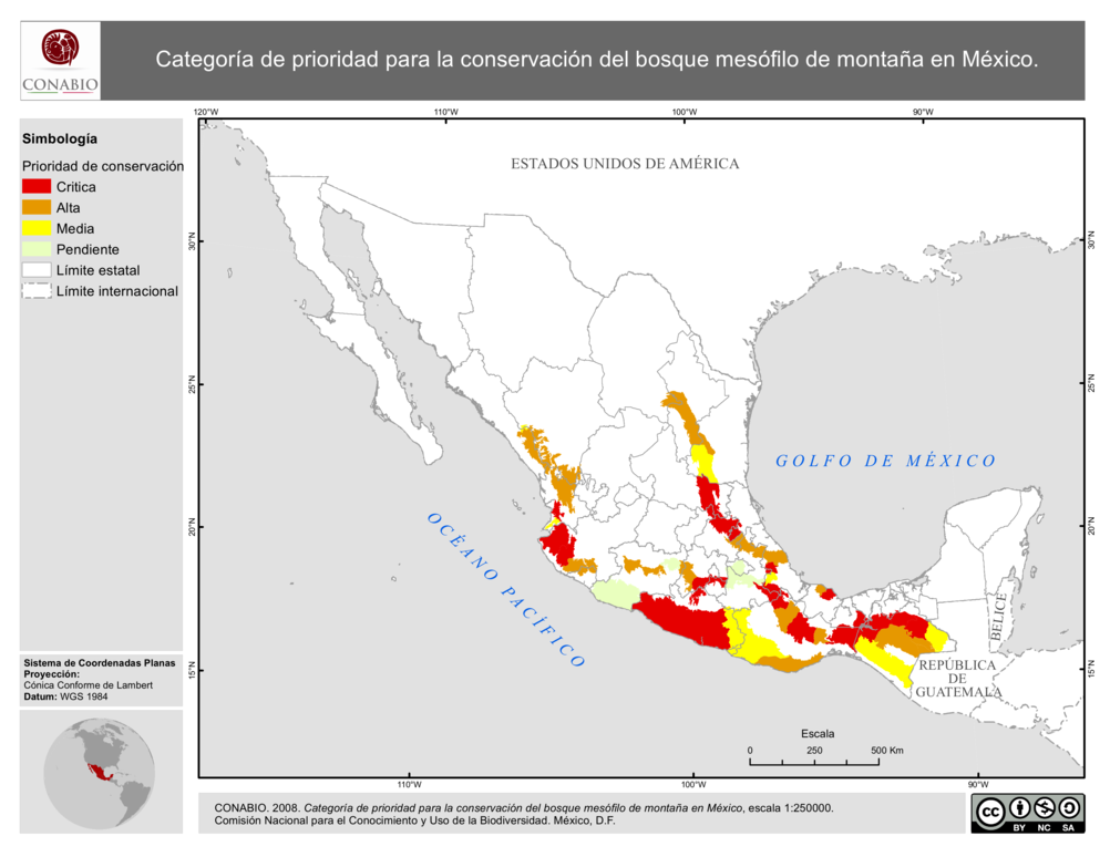 - CONABIO, (2008). 'Categoría de prioridad para la conservación del bosque mesófilo de montaña en México.', escala: 1:250000. Comisión Nacional para el Conocimiento y Uso de la Biodiversidad. México, D.F..