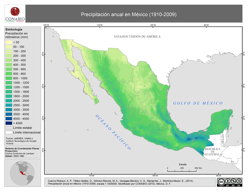 - Cuervo-Robayo, A. P., Téllez-Valdés, O., Gómez-Albores, M. A., Venegas-Barrera, C. S., Manjarrez, J., Martínez-Meyer, E., (2014). 'Precipitación anual en México (1910-2009)', escala: 1:1000000. modificado por CONABIO (2015). México, D. F..