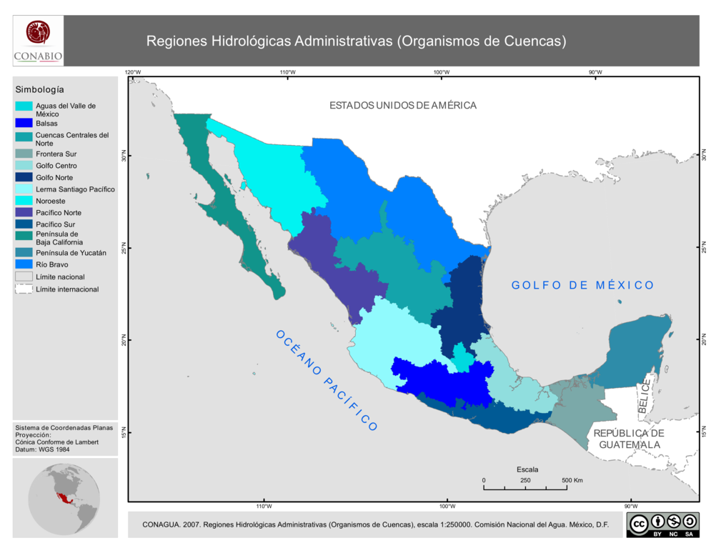 - Hidrología Regiones hidrológicas y Cuencas 1:250000 Aspecto físico CONAGUA Hidrología Organismos de Cuenca Regionalización Unidades Administrativas