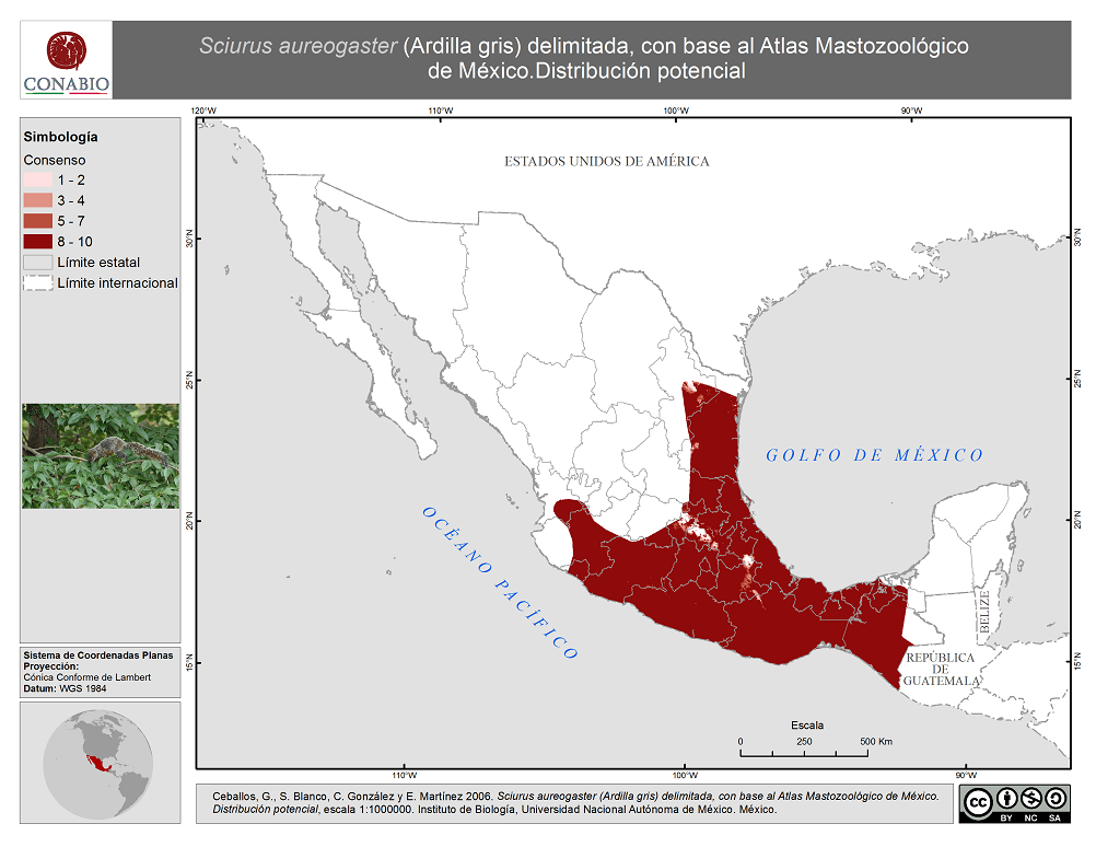 - Ceballos, G., S. Blanco, C. González, E. Martínez, (2006). 'Sciurus aureogaster (Ardilla gris) delimitada, con base al Atlas Mastozoológico de México. Distribución potencial', escala: 1:1000000. Instituto de Biología, Universidad Nacional Autónoma de México. Proyecto: DS006, Extraído del proyecto DS006 'Modelado de la distribución de las especies de mamíferos de México para un análisis GAP'. Escala 1:1000000. El proyecto fue financiado por la Comisión Nacional para el Conocimiento y Uso de la Biodiversidad, México.. México.