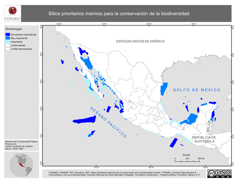- La planificación de la conservación de la biodiversidad marina es fundamental ya que un componente esencial de la megadiversidad de México son los ambientes costeros, oceánicos e insulares. Estos ecosistemas son de importancia crítica ya que en ellos habitan una gran cantidad de especies tanto endémicas como de distribución amplia y al mismo tiempo son sitios importantes de reproducción, anidación, descanso y alimentación de la fauna marina y aves migratorias. Debido a las grandes diferencias en conocimiento y disponibilidad de información sobre la biodiversidad de las diferentes regiones marinas de México, se decidió utilizar la opinión de expertos para la identificación de los sitios prioritarios para la conservación de la biodiversidad marina, que incluye costas, océanos e islas. Para este fin, el 4 y 5 de octubre de 2005 se efectuó en la ciudad de México el Taller para la determinación de sitios prioritarios marinos y costeros para la conservación, organizado por CONABIO, CONANP, Pronatura y TNC. Los sitios identificados fueron posteriormente delimitados y validados por medio de un sitio WiKi en internet, el cual sirvió como un portal para el intercambio de información y opiniones entre los participantes del Taller, al que se sumó otro grupo de especialistas. El resultado final fueron 105 sitios marinos.