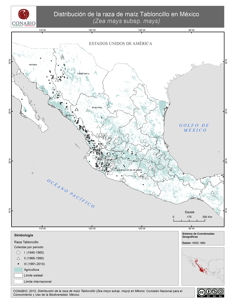 - CONABIO, (2015). 'Tabloncillo en México. Distribución de la raza de maíz', escala: 1:1. Comisión Nacional para el Conocimiento y Uso de la Biodiversidad. Datos obtenidos del Proyecto Global de Maíces Nativos.. México, D.F..
