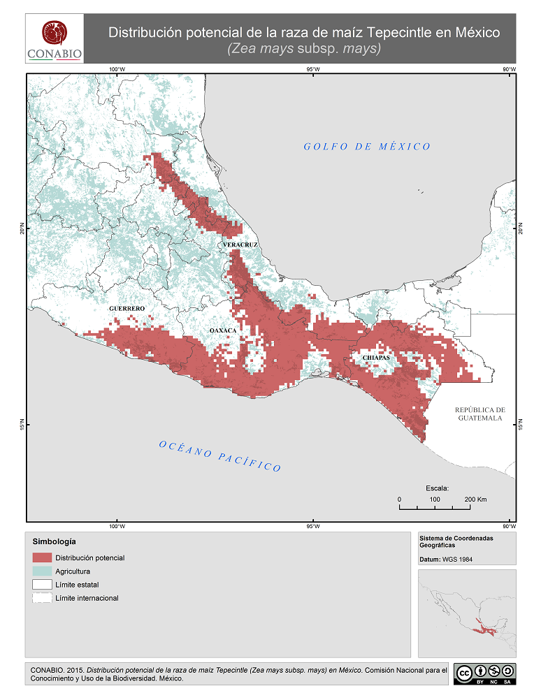 - CONABIO, (2015). 'Tepecintle en México. Distribución potencial de la raza de maíz', Comisión Nacional para el Conocimiento y Uso de la Biodiversidad. Se realizó el mapa de distribución de la raza de maíz Tepecintle de México, a partir de modelos de distribución potencial realizados por Perales y Golicher en 2011. Dichos modelos fueron generados a partir de los resultados del Proyecto Global de Maíces Nativos, que fue coordinado por la CONABIO junto con el Instituto Nacional de Investigaciones Forestales, Agrícolas y Pecuarias (INIFAP) y el Instituto Nacional de Ecología, ahora Instituto Nacional de Ecología y Cambio Climatico (INECC).. México, D.F..