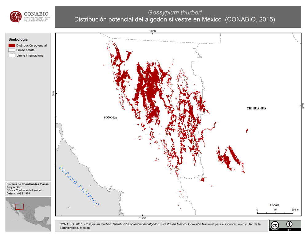 - El modelo de distribución potencial de Gossypium thurberi, fue generado por el Biól. Jesús Alarcón Guerrero, Especialista de Información Espacial de la CONABIO, a partir de los datos de distribución de la especie seleccionados por la especialista, Dra. Ana Laura Wegier Briuolo. Referencias en la web: https://www.biodiversidad.gob.mx/media/1/genes/files/Informe_Final_Gossypium.pdf