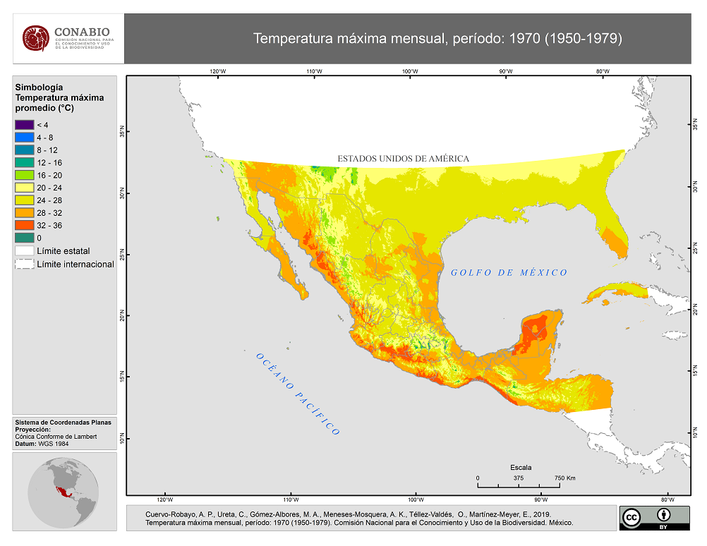 - Cuervo-Robayo A.P., C. Ureta, M.A. Gómez-Albores, A.K. Meneses-Mosquera, O. Téllez-Valdés, E. Martínez-Meyer, (27/08/2019). 'Temperatura máxima mensual, periodo: 1970 (1950-1979)', edición: 1. Instituto de Biología, Universidad Nacional Autónoma de México. Estos mapas forman parte de la publicación: Cuervo-Robayo, A. P., Ureta, C., Gómez-Albores, M. A., Meneses-Mosquera, A. K., Téllez-Valdés, O., y E. Martínez-Meyer. (2020). One hundred years of climate change in Mexico. Plos One. https://doi.org/10.1371/journal.pone.0209808. Ciudad de México, México.