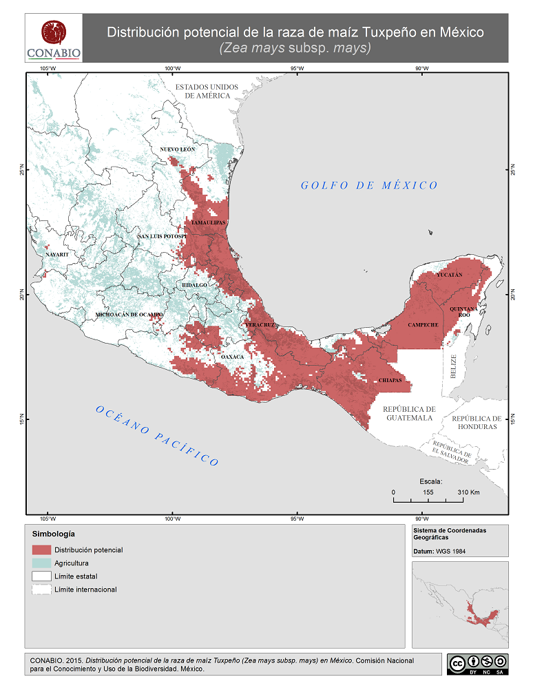 - CONABIO, (2015). 'Tuxpeño en México. Distribución potencial de la raza de maíz', Comisión Nacional para el Conocimiento y Uso de la Biodiversidad. Se realizó el mapa de distribución de la raza de maíz Tuxpeño de México, a partir de modelos de distribución potencial realizados por Perales y Golicher en 2011. Dichos modelos fueron generados a partir de los resultados del Proyecto Global de Maíces Nativos, que fue coordinado por la CONABIO junto con el Instituto Nacional de Investigaciones Forestales, Agrícolas y Pecuarias (INIFAP) y el Instituto Nacional de Ecología, ahora Instituto Nacional de Ecología y Cambio Climatico (INECC).. México, D.F..