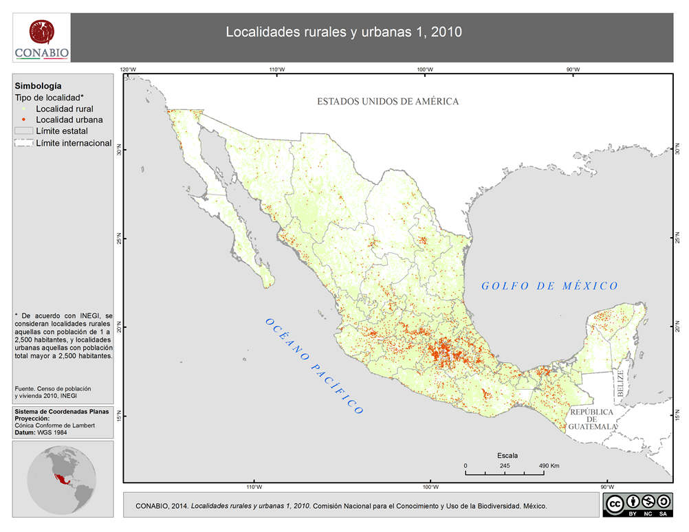 - El mapa presenta las 192,247 localidades de México registradas en el censo de población y vivienda 2010, y su asignación como poblaciones urbanas o rurales de acuerdo con los rangos establecidos por INEGI. Las variables representadas son: 1) población total; 2) tipo de localidad (urbana o rural).
