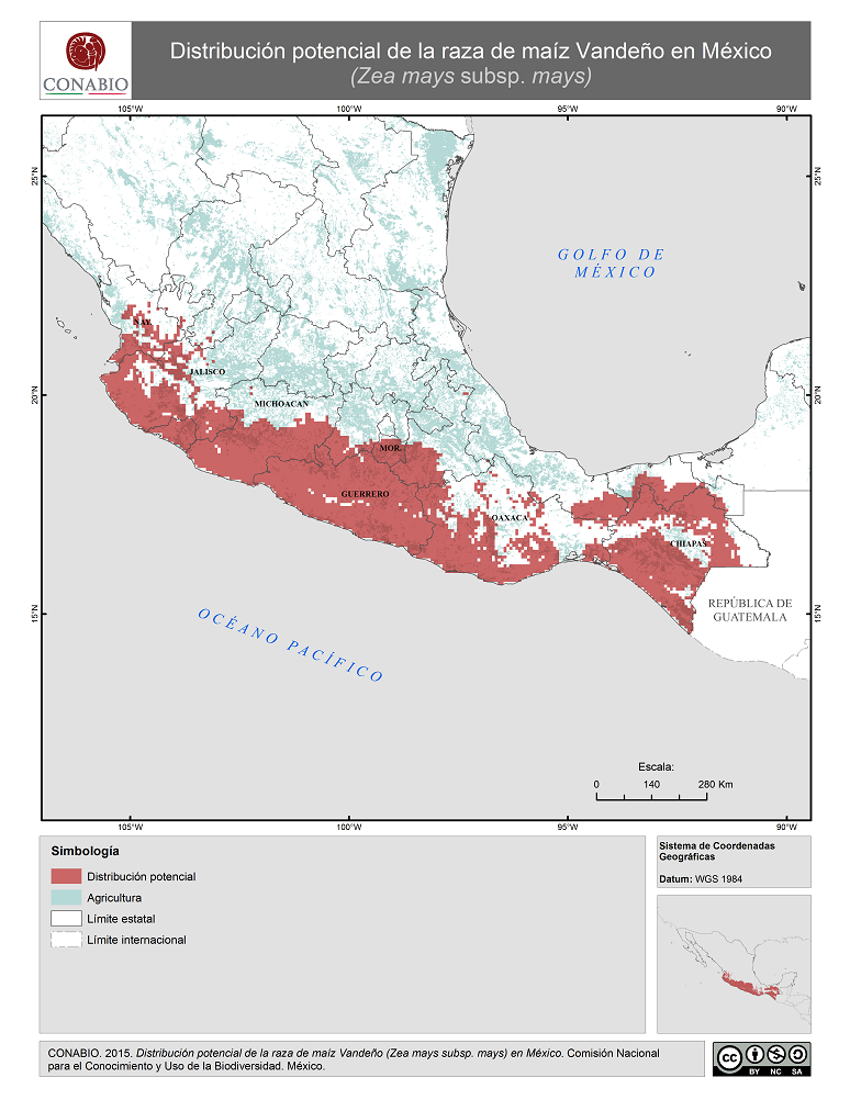 - CONABIO, (2015). 'Vandeño en México. Distribución potencial de la raza de maíz', Comisión Nacional para el Conocimiento y Uso de la Biodiversidad. Se realizó el mapa de distribución de la raza de maíz Vandeño de México, a partir de modelos de distribución potencial realizados por Perales y Golicher en 2011. Dichos modelos fueron generados a partir de los resultados del Proyecto Global de Maíces Nativos, que fue coordinado por la CONABIO junto con el Instituto Nacional de Investigaciones Forestales, Agrícolas y Pecuarias (INIFAP) y el Instituto Nacional de Ecología, ahora Instituto Nacional de Ecología y Cambio Climatico (INECC).. México, D.F..