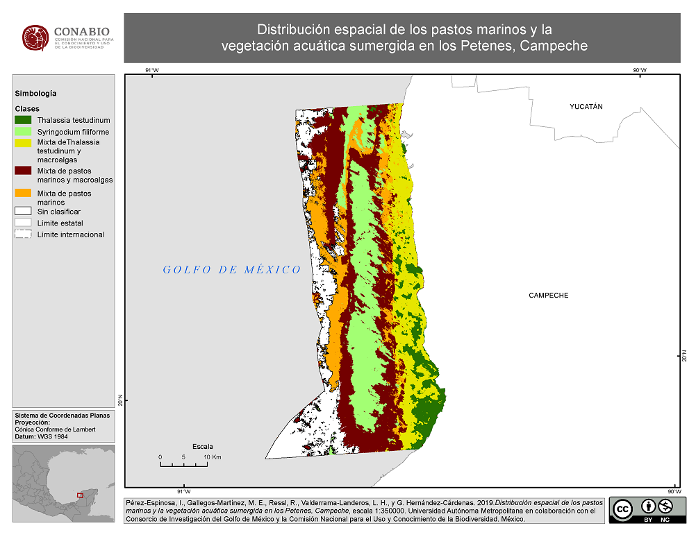 - Pérez-Espinosa, I., Gallegos-Martínez, M. E., Ressl, R., Valderrama-Landeros, L. H., G. Hernández-Cárdenas., (01/10/2019). 'Distribución espacial de los pastos marinos y la vegetación acuática sumergida en los Petenes, Campeche', escala: 1:350000. edición: 1. Universidad Autónoma Metropolitana Unidad Iztapalapa. Ciudad de México, México.