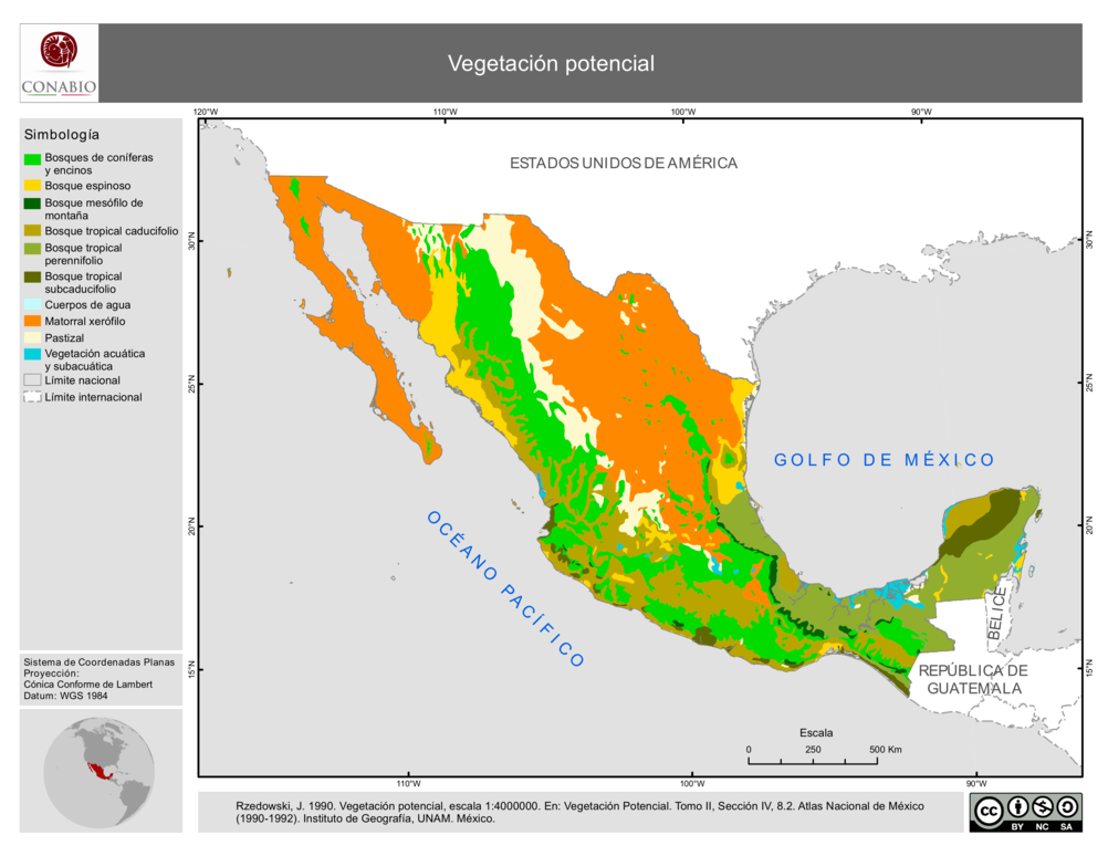 - Este mapa presenta la vegetación potencial de México en escala 1:4000000 en coordenadas geográficas, de acuerdo a Rzedowski, extraído del Atlas Nacional de México. Los datos cartográficos se obtuvieron a partir de la digitalización del mapa impreso.