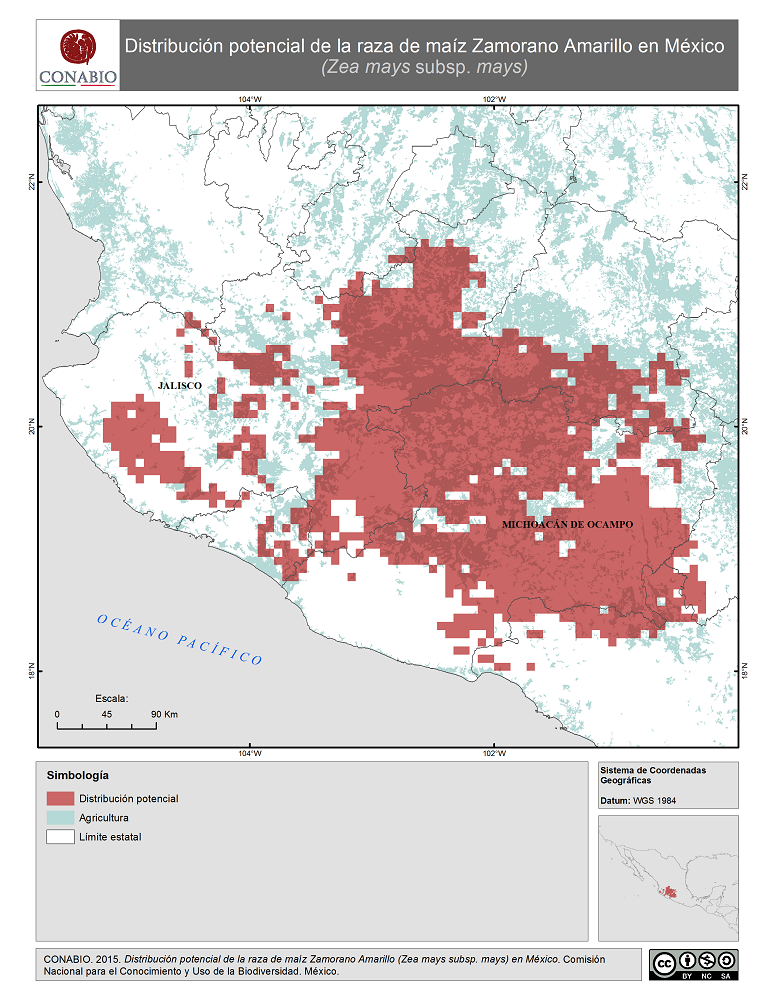 - CONABIO, (2015). 'Zamorano Amarillo en México. Distribución potencial de la raza de maíz', Comisión Nacional para el Conocimiento y Uso de la Biodiversidad. Se realizó el mapa de distribución de la raza de maíz Zamorano Amarillo de México, a partir de modelos de distribución potencial realizados por Perales y Golicher en 2011. Dichos modelos fueron generados a partir de los resultados del Proyecto Global de Maíces Nativos, que fue coordinado por la CONABIO junto con el Instituto Nacional de Investigaciones Forestales, Agrícolas y Pecuarias (INIFAP) y el Instituto Nacional de Ecología, ahora Instituto Nacional de Ecología y Cambio Climatico (INECC).. México, D.F..