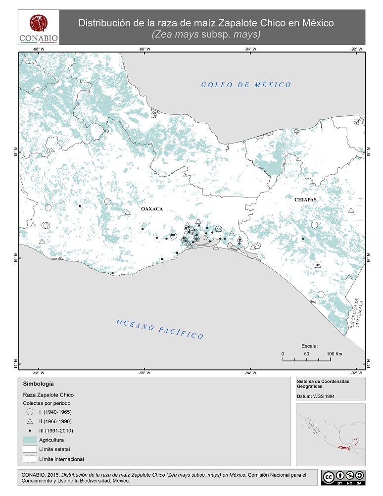 - El mapa muestra la distribución de los sitios de colecta de la raza de maíz Zapalote Chico en México que contiene 137 registros integrados a partir de la información que se obtuvo de 2 proyectos de computarización de colecciones y recolecta, llevados a cabo por diferentes instituciones e investigadores nacionales y auspiciados en el marco del proyecto denominado 'Proyecto Global de Maíces Nativos'.